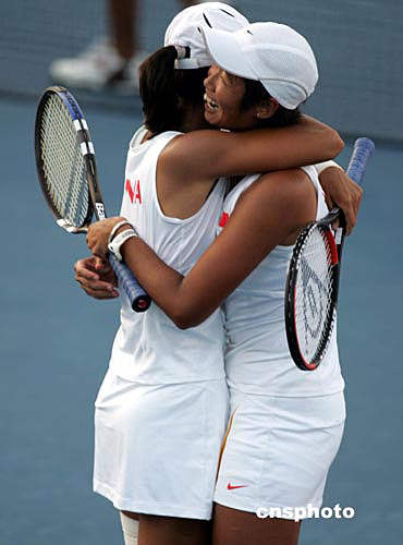 雅典當(dāng)?shù)貢r(shí)間8月20日傍晚,中國(guó)網(wǎng)球選手孫甜甜、李婷(前)在半決賽中以九比七戰(zhàn)勝阿根廷選手,歷史性地闖入奧運(yùn)會(huì)女子網(wǎng)球雙打決賽。中新社記者:任晨鳴