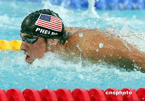當(dāng)?shù)貢r間八月二十日晚,美國神童菲爾普斯在雅典奧運男子一百米蝶泳比賽中獲得金牌。中新社記者:毛建軍