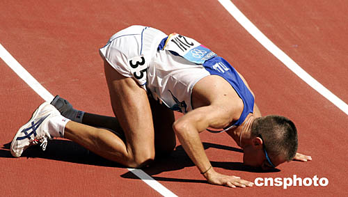 圖為意大利選手布魯格內蒂在贏得男子20公里競走冠軍后親吻大地的場面。