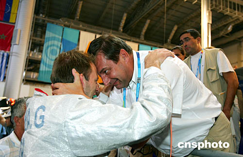 圖為在法國隊奪取男子配劍團體冠軍后,法國體育部長拉穆爾擁抱選手的場面。