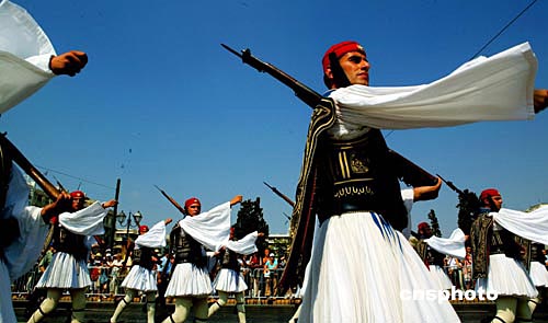 在雅典無名戰(zhàn)士紀(jì)念碑前站崗的希臘王家衛(wèi)隊(duì)衛(wèi)兵,身著當(dāng)年?duì)幦∶褡濯?dú)立戰(zhàn)爭(zhēng)時(shí)期山區(qū)戰(zhàn)士的裝束。成為一名王家衛(wèi)隊(duì)衛(wèi)兵是很多希臘青年的夢(mèng)想。中新社記者:王瑤