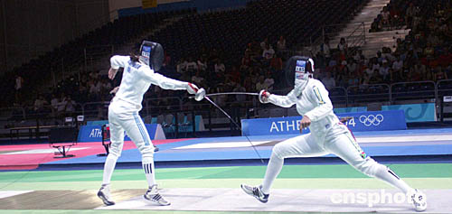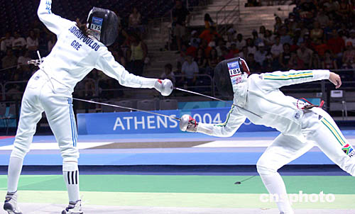 圖為在當(dāng)?shù)貢r間8月20日舉行的女子擊劍比賽中,希臘選手和南非共和國選手展開激烈對攻。
