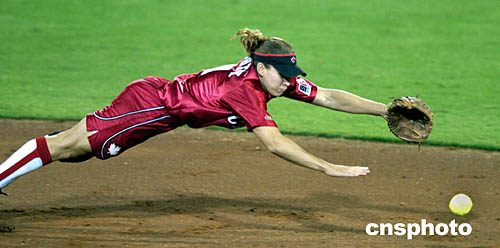 圖為在當?shù)貢r間8月19日舉行的加拿大和澳大利亞壘球比賽中,加拿大選手的精彩表現(xiàn)。