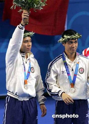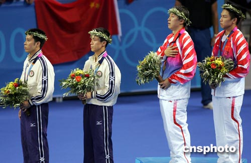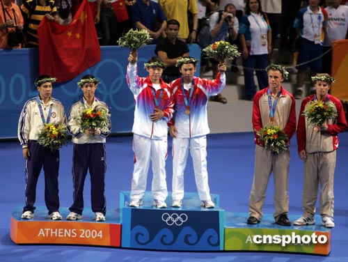 雅典當(dāng)?shù)貢r(shí)間8月21日下午,中國(guó)乒乓球選手馬琳、陳玘在男雙決賽中以4比2戰(zhàn)勝香港選手李靜、高禮澤,獲得本屆奧運(yùn)會(huì)男子雙打冠軍。中新社記者:任晨鳴