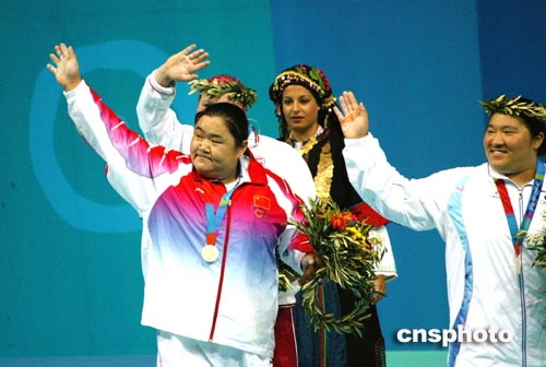 當(dāng)?shù)貢r(shí)間8月21日,中國(guó)選手唐功紅在雅典奧運(yùn)女子75公斤以上級(jí)舉重比賽中,打破挺舉和總成績(jī)兩項(xiàng)世界紀(jì)錄,奪得該項(xiàng)目的金牌。中新社記者:王瑤