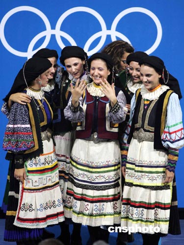 當?shù)貢r間八月二十二日下午,雅典奧運會射擊比賽全部結(jié)束,身著民族服裝的頒獎女郎在五環(huán)前留影。中新社記者:毛建軍