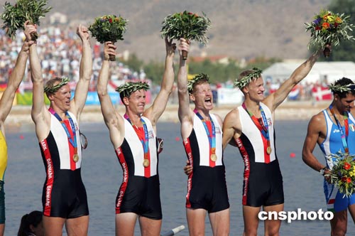 當?shù)貢r間八月二十二日,丹麥選手獲得雅典奧運男子四人單槳賽艇比賽冠軍。中新社記者:毛建軍