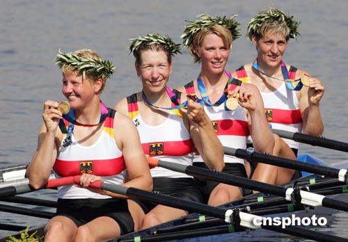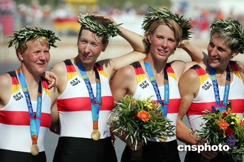 當(dāng)?shù)貢r間八月二十二日,德國隊(duì)在雅典奧運(yùn)女子四人雙槳賽艇比賽中獲得冠軍。中新社記者:毛建軍