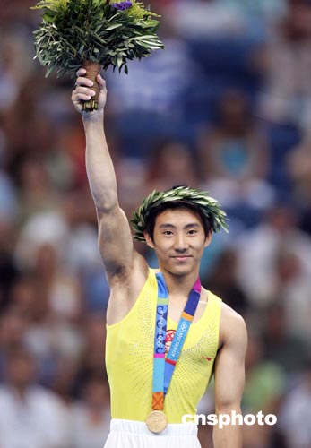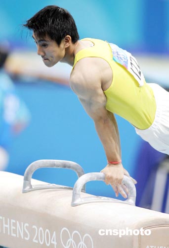 當(dāng)?shù)貢r間八月二十二日晚,中國體操選手滕海濱以9.837分獲得雅典奧運(yùn)男子鞍馬冠軍,為中國體操隊(duì)奪得本屆奧運(yùn)會第一枚金牌。中新社記者:毛建軍