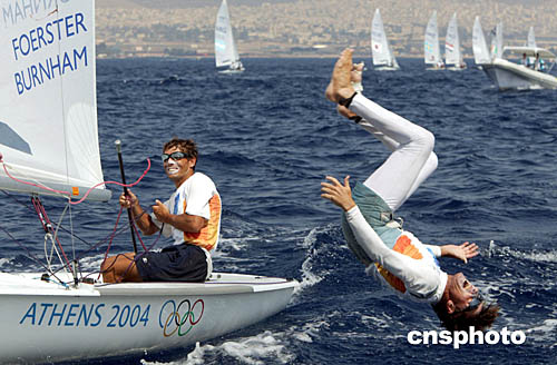 圖為英國選手保羅-福爾斯特(Paul Foerster)和凱文-豪爾(Kevin Hall)在勇奪男子"470"型帆板比賽后慶祝的場面。
