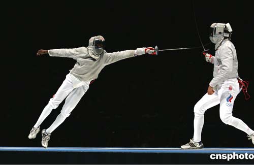 當(dāng)?shù)貢r間8月19日,美國選手Ivan Lee與俄羅斯選手Serguei Charikov在男子佩劍團體三、四名決賽中的爭奪。