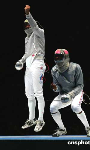 在當(dāng)?shù)貢r(shí)間19日舉行的男子佩劍團(tuán)體三、四名決賽中,俄羅斯選手Serguei Charikov(左)在戰(zhàn)勝美國(guó)選手Ivan Lee后,表現(xiàn)十分激動(dòng)。