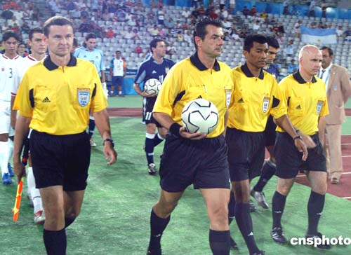 當(dāng)?shù)貢r(shí)間21日,在阿根廷與哥斯達(dá)黎加之間進(jìn)行了一場(chǎng)足球四分之一決賽。圖為該場(chǎng)比賽的主裁判Kyros VASSARAS以及三位助理裁判。