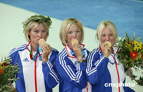 圖為英國運(yùn)動(dòng)員本·安斯利(Ben Ainslie)和英國選手arah Webb, skipper Shirley Robertson,Sarah Ayton在奪得帆船芬蘭人級(jí)比賽和三人女子龍骨船-鷹鈴級(jí)帆船比賽冠軍后親吻金牌的場(chǎng)面。