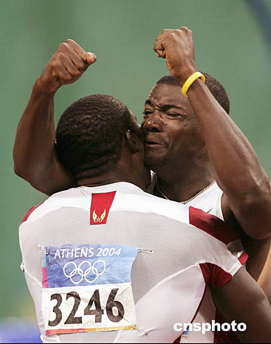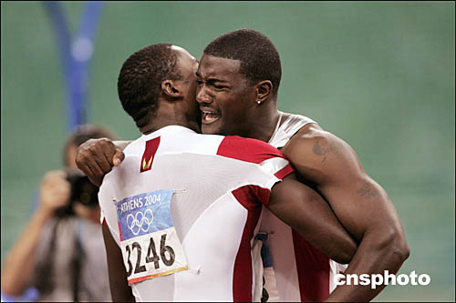 圖為美國(guó)選手加特林(Justin Gatlin)在勇奪男子百米冠軍后緊緊擁抱師出同門的肖恩·克勞福德(Shawn Crawford)