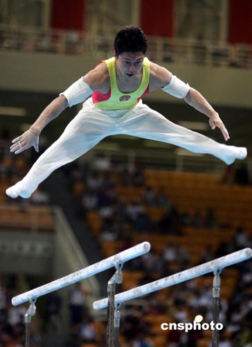 中國(guó)選手李小鵬在團(tuán)體預(yù)賽中兩次試跳起評(píng)分為十分的兩組動(dòng)作,都得到了相同分?jǐn)?shù),以九點(diǎn)八分排在第一,極有希望問(wèn)鼎冠軍。然而今天第四個(gè)出場(chǎng)的他并未表現(xiàn)出最佳狀態(tài)。第一跳助跑時(shí)他沒(méi)有調(diào)整好步伐,落地坐在了墊子上,只有九點(diǎn)零七五分。第二跳中,他使用了“踺子后手翻轉(zhuǎn)體一百八十度接直體前空翻轉(zhuǎn)體九百度”的“李小鵬跳”,動(dòng)作完成得不錯(cuò),只是落地邁了一大步,兩跳平均得到九點(diǎn)三六八分。