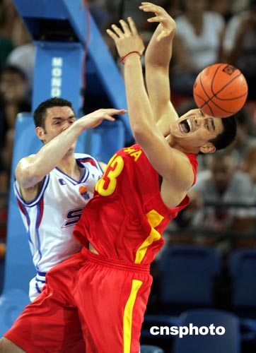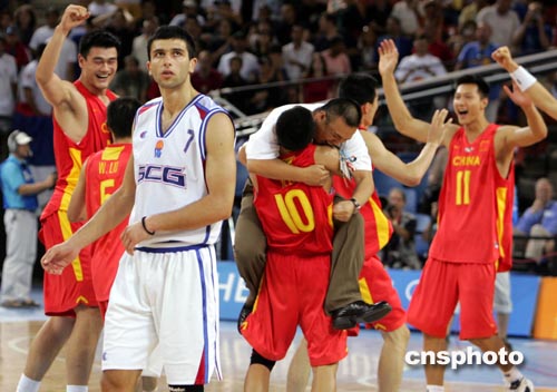 當(dāng)?shù)貢r(shí)間八月二十三日下午,中國男籃在雅典奧運(yùn)會(huì)小組賽最后一場比賽中以67:66一分險(xiǎn)勝塞黑隊(duì),闖入前八名,姚明打滿全場,依然是球隊(duì)獲勝的頂梁柱。中新社記者:任晨鳴