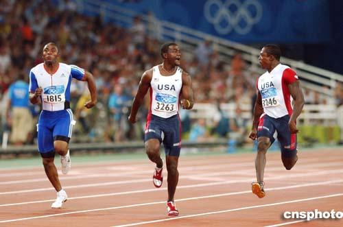 在當?shù)貢r間22日進行的男子100米半決賽中,美國選手Justin Gatlin和Shawn Crawford一邊比賽,一邊交談。