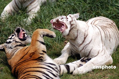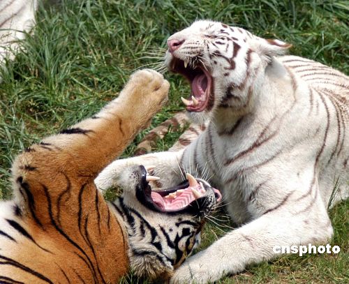 8月22日,在南京紅山森林野生動物園獅虎園內(nèi),一只白虎和另一只老虎十分親熱,一會相互張嘴,一會相互擁抱……盡情享受秋日的涼爽。江南(南京) 攝