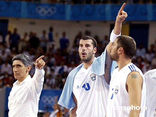 圖為在當(dāng)?shù)貢r(shí)間8月23日舉行的男子籃球賽希臘對(duì)陣波多黎哥中,希臘教練Panagiotis GIANNAKIS指揮隊(duì)員們比賽的場(chǎng)景。