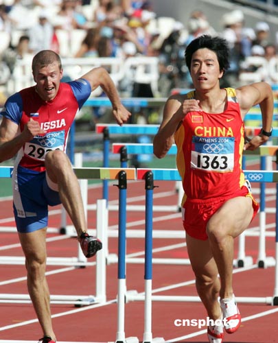 當(dāng)?shù)貢r間八月二十四日,中國著名田徑選手劉翔(右)亮相雅典奧運(yùn)賽場,在男子一百一十米跨欄預(yù)賽中,以十三秒二七的成績名列小組第一進(jìn)入第二輪預(yù)賽。中新社記者:毛建軍