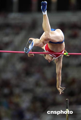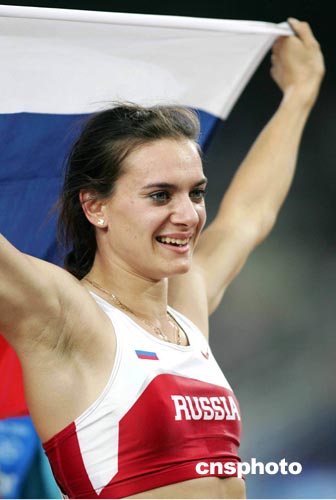 在全場(chǎng)觀眾的歡呼聲中,俄羅斯女將伊辛巴耶娃今晚在雅典奧運(yùn)會(huì)田徑賽場(chǎng)神奇般地越過(guò)四米九一,不僅將奧運(yùn)會(huì)女子撐桿跳金牌歸于名下,并且創(chuàng)造了田徑賽事開(kāi)賽以來(lái)首項(xiàng)世界紀(jì)錄。
