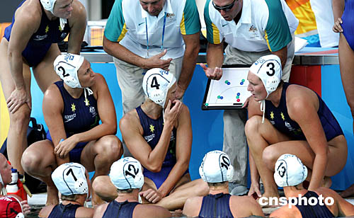 圖為在女子手球比賽現(xiàn)場,教練在現(xiàn)場部署戰(zhàn)術(shù)。最后希臘隊戰(zhàn)勝澳大利亞隊挺進決賽。