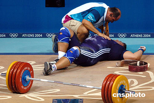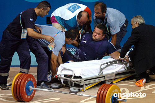 圖為在當?shù)貢r間8月25日舉行的男子舉重比賽中,挪威選手STAIN GRIMSETH不慎膝蓋受傷,醫(yī)護人員緊急把他抬出場地。