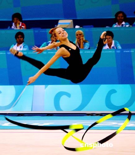 雅典當地時間八月二十五日,烏克蘭藝術體操個人全能選手GODUNKO.N賽前排練帶操。中新社記者:王瑤