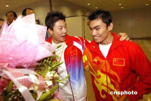8月26日,北京首都國際機(jī)場又迎來一批載譽(yù)歸來的奧運(yùn)健兒,包括羽毛球、乒乓球、游泳、體操、舉重等200多名選手,他們在機(jī)場受到英雄般的歡迎,幾乎每個(gè)人都被鮮花包圍。圖為中國體操名將李小鵬(左)在鮮花的簇?fù)硐屡c前來迎接的隊(duì)友梁富亮相談甚歡。中新社記者:盛佳鵬