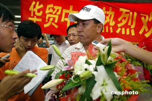 8月26日,北京首都國際機場又迎來一批載譽歸來的奧運健兒,包括羽毛球、乒乓球、游泳、體操、舉重等200多名選手,他們在機場受到英雄般的歡迎,幾乎每個人都被鮮花包圍。圖為中國羽毛球隊總教練李永波甫抵機場就成為記者采訪焦點。中新社記者:盛佳鵬