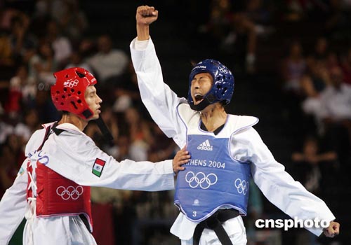 當(dāng)?shù)貢r間八月二十六日晚,在雅典奧運(yùn)會男子五十八公斤級跆拳道決賽中,中國臺北選手朱木炎戰(zhàn)勝墨西哥選手SALAZAR獲得金牌。中新社記者:毛建軍