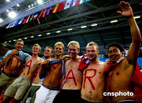 當(dāng)?shù)貢r(shí)間8月26日晚,丹麥女子手球隊(duì)以32比28戰(zhàn)勝中國(guó)隊(duì)進(jìn)入四強(qiáng),丹麥球迷以獨(dú)特的方式慶祝這一勝利。中新社記者:王瑤