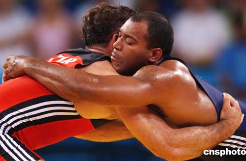 圖為當(dāng)?shù)貢r間26日舉行的男子古典式96公斤級摔交比賽中,Mehmet Ozal與Ernesto Pena的精彩搏斗。