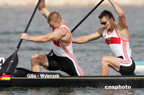當(dāng)?shù)貢r(shí)間八月二十七日,在雅典奧運(yùn)會(huì)男子雙人劃艇一千米比賽中,德國(guó)選手GILLE與WYLENZEK獲得冠軍。中新社記者:毛建軍