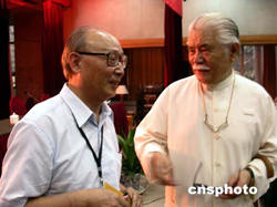 八月二十七日“黃賓虹國際學(xué)術(shù)研討會”在北京開幕。著名畫家邵大箴(左)與臺灣著名藝術(shù)家李奇茂(右)出席“黃賓虹國際學(xué)術(shù)研討會”。作者:王磊