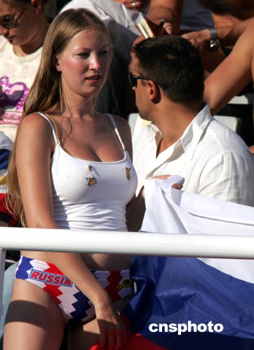 當?shù)貢r間8月27日下午,雅典奧運會男子水球比賽進入白熱化階段,志在奪取金牌的俄羅斯隊(藍帽)以5比7負于匈牙利隊,從而無緣金牌。俄羅斯的球迷人數(shù)雖少,但是熱情四射的女球迷依然奪人眼目。中新社記者:任晨鳴