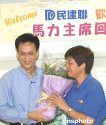 民建聯(lián)主席馬力早時(shí)在內(nèi)地接受切除結(jié)腸癌手術(shù)﹐28日出院返回香港﹐民建聯(lián)中常委在總部設(shè)歡迎會(huì)﹐歡迎馬力主席手術(shù)成功返港﹐蔡素玉向馬力送花。中新社記者:趙振清