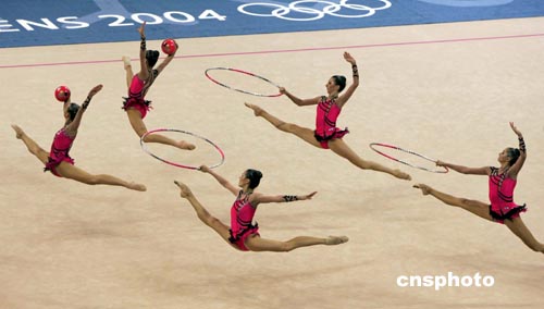 中新社雅典八月二十八日電 雅典當(dāng)?shù)貢r間今天傍晚結(jié)束的奧運會藝術(shù)體操團(tuán)體決賽中,世界第一強(qiáng)隊——俄羅斯隊以五十一點一的高分毫無爭議地登上了這個項目的最高領(lǐng)獎臺,從而衛(wèi)冕成功。矢志進(jìn)入奧運會前四的中國隊未能完成理想目標(biāo),僅以四十六點五分屈居第五。