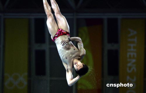 當(dāng)?shù)貢r(shí)間8月28日晚,在雅典奧運(yùn)會(huì)跳水最后一項(xiàng)比賽--10米跳臺(tái)決賽中,奪標(biāo)呼聲最高的“跳水王子”田亮意外失手,僅僅獲得第三名。中新社記者:任晨鳴