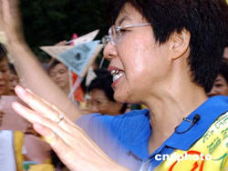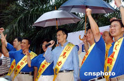 八月二十九日,香港民建聯(lián)舉行2004立法會(huì)選舉誓師大會(huì),剛剛手術(shù)出院的民建聯(lián)主席馬力與港島區(qū)候選人一起在誓師大會(huì)上,為進(jìn)軍2004立法會(huì)選舉造勢(shì)。作者:錢興強(qiáng)