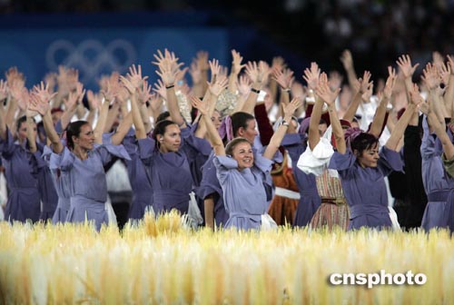 在由四萬五千多片金黃的麥穗裝點的舞臺上,伴隨希臘傳統(tǒng)音樂和特色民歌,在色彩斑斕的玻璃馬賽克鋪就的道路上,人們翩翩起舞,展示著雅典人收獲的喜悅,表達他們對奧運會的祝福。