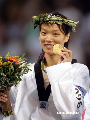 當?shù)貢r間八月二十九日,中國選手陳中在雅典奧運女子六十七公斤以上級跆拳道決賽中戰(zhàn)勝法國選手獲得冠軍。中新社記者:毛建軍