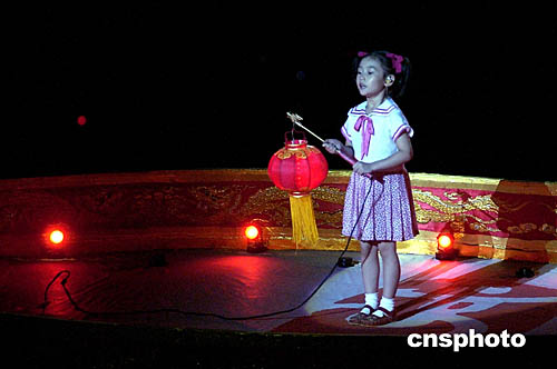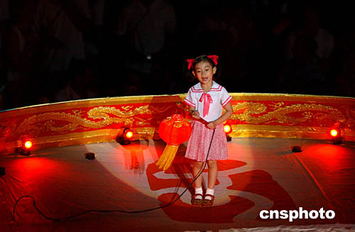 圖為在閉幕式現(xiàn)場,中國女孩向全世界的人們發(fā)出邀請,歡迎他們2008年到北京來的場面。