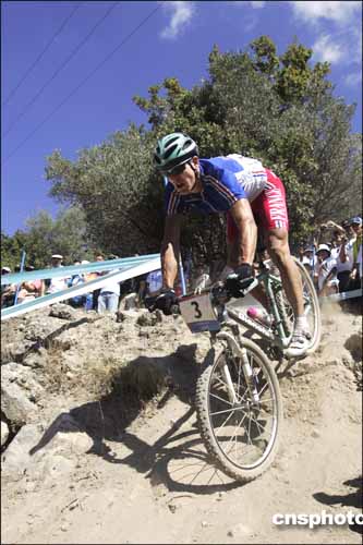 在當?shù)貢r間28日進行的山地男子自行車越野比賽中,法國選手阿布薩隆用時2小時15分03秒,獲得冠軍。