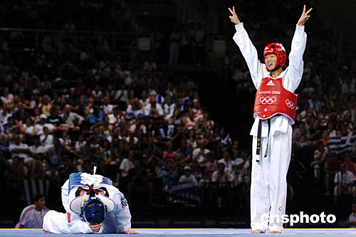 圖為在當(dāng)?shù)貢r(shí)間8月29日舉行的女子67公斤級(jí)的跆拳道比賽中,中國選手陳中擊敗法國選手為中國隊(duì)奪得第32枚金牌。