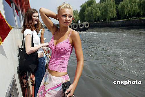 世界模特大賽參賽佳麗游覽杭州 參加世界模特大賽的選手乘船沿運河游覽