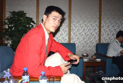 8月31日,中國奧運(yùn)健兒載譽(yù)回京,對中國男籃成績不滿意的“小巨人”姚明避開外面的熱鬧歡迎場面在休息室里擺弄手機(jī)。作者:韓藝冰