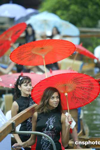 8月31日,參加“時(shí)尚杭州之旅”2004年新絲路世界模特大賽的29個國家和地區(qū)的40多名參賽佳麗在浙江省杭州乘木船、撐油紙傘泛舟西湖。世界模特大賽決賽將與9月5日在杭州舉行。中新社記者:盛佳鵬