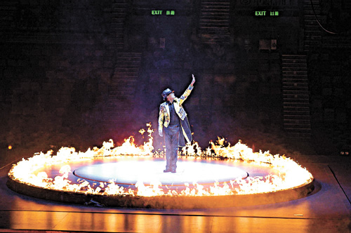 華仔前晚的個(gè)唱以爆發(fā)大型火圈作揭幕,他站在升高的舞臺(tái)上,舉手點(diǎn)起舞臺(tái)之火;紅館立時(shí)出現(xiàn)一個(gè)直徑廿一尺之大火圈,把他團(tuán)團(tuán)圍著,他就在這個(gè)大火圈之中,配合舞臺(tái)機(jī)關(guān),突然現(xiàn)身又突然隱形,有如大衛(wèi)高柏飛般表演魔法。而華仔在紅館所引發(fā)的舞臺(tái)圣火,同時(shí)是“紅館”有史以來燃點(diǎn)最大的火特技,為了引發(fā)這一場效果,他個(gè)多月前親身到清水舞臺(tái)日本基地試火;舞臺(tái)運(yùn)來香港后,也經(jīng)過紅館多番審核,由引火的石油氣到表演時(shí)控制火勢大小,都要通過測試,大會(huì)一共經(jīng)過三次試火,才獲批準(zhǔn)表演。而舞臺(tái)下面亦藏有多罐石油氣體作燃料,“紅館”十分擔(dān)心安全問題,下令這個(gè)項(xiàng)目必定要在開幕進(jìn)行,免得演唱會(huì)兩個(gè)多小時(shí)內(nèi)臺(tái)底存放過多易燃物品,表演一旦完成,臺(tái)底的石油氣罐要馬上由工作人員移走到安全地點(diǎn),免生意外。